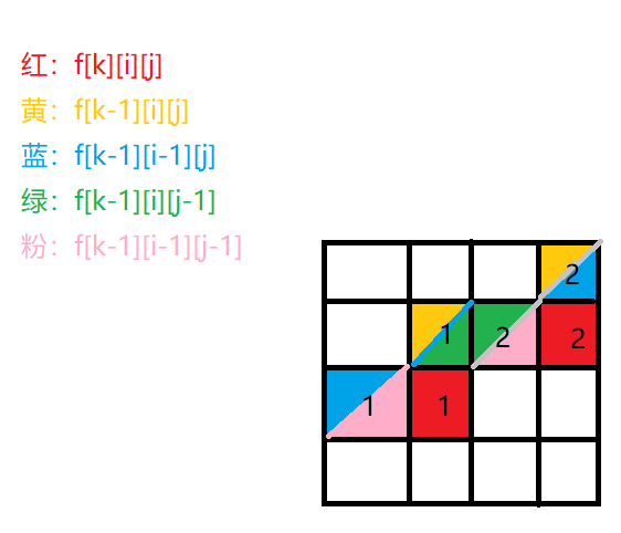 $$f[k][i][j]=max(f[k-1][i][j],f[k-1][i-1][j]f[k-1][i][j-1]f[k-1][i-1][j-1])+[(i==j)?map[k-i+1][i]:map[k-i+1][i] + map[k-j+1][j]]$$