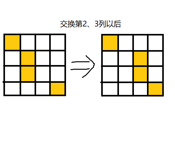 如图,我们发现第3列没有黄格,第2列有2个黄格,但交换了第2、3列以后,第2列就没有黄格了。所以说,在进行一种操作的基础上,进行另一种操作无非是拆东墙,补西墙。